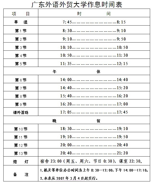 1、请各位同学认真查看上课节数,按具体的上课时间准时上课。学校作息表如下。