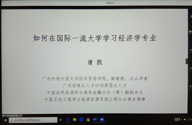 7月21日下午,《如何在国际一流大学学习经济学专业》线上讲座在腾讯会议举行。广东外语外贸大学经济贸易学院副教授、云山学者、广东省珠江人才计划高层次人才唐凯分享了国际一流大学学习经济学专业的经验,经济学专业在校本科生参加了本次线上讲座。