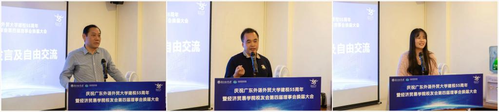 在校友代表发言及自由交流环节,新任名誉会长李作雄(84级)、蓝斌男(89级)、曾德祥(89级)、副会长陈秉霖(86级)等人都表达了对母校母院的热爱之情,并一致表示只要学校学院有需要,校友们一定全力以赴,助力建设。教师代表沈伯明也对多年来为经贸学院建设出资出力的校友们表达了感谢和祝福。经贸学院第四届理事会换届大会在校友师生们的自由交流中圆满结束。