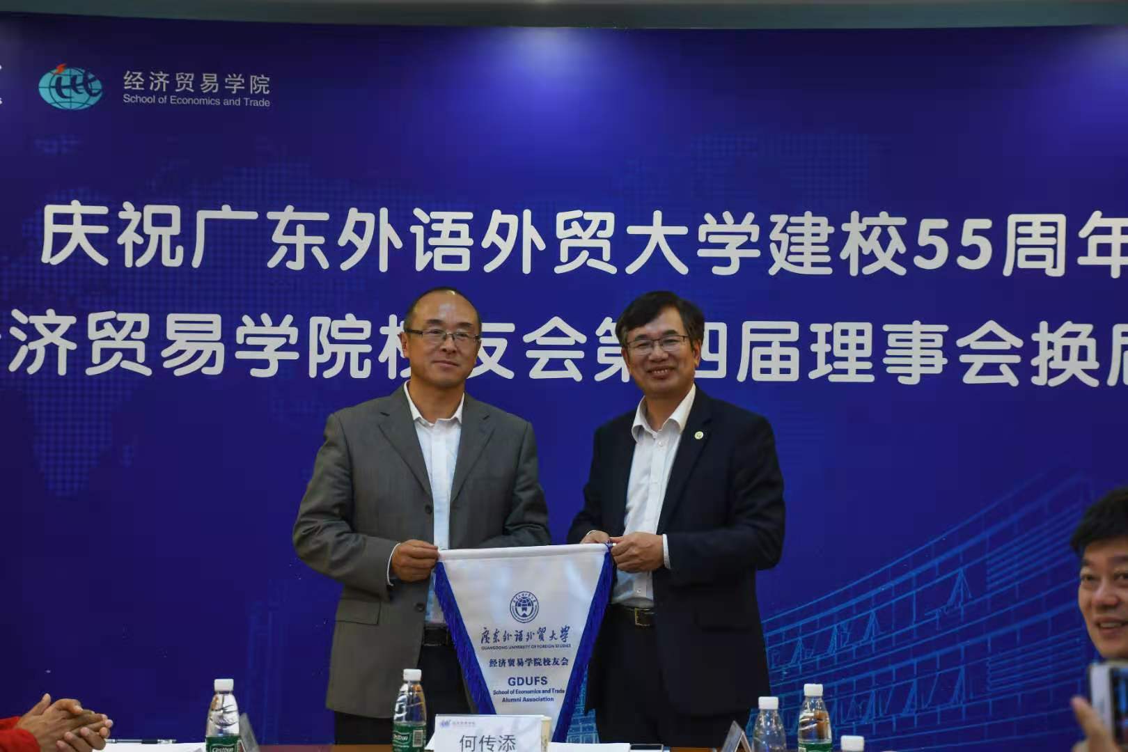 大会审议通过了经贸学院校友会第四届理事会成员名单,经济贸易学院院长张建武参会并当选第四届理事会会长,何传添为其颁发校友会会旗。参加此次会议的还有学院党委书记梁洁,副院长肖奎喜、王俊、唐静,院长助理杨博等学院领导老师。
