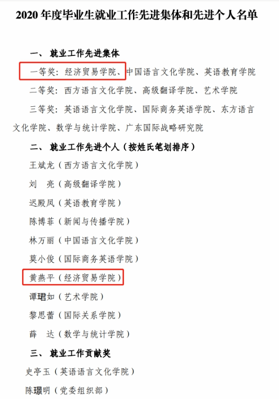 近日,广东外语外贸大学就业指导中心公布了2020年度毕业生就业工作先进集体和先进个人评选结果,我院获评“就业工作先进集体一等奖”,我院辅导员黄燕平获评“就业工作先进个人”荣誉称号。