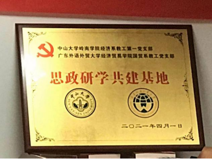 2021年4月1日下午,由中山大学岭南学院经济系教工第一党支部和广东外语外贸大学经济贸易学院国贸系教工党支部合作成立的思政研学共建基地的揭牌仪式在中山大学岭南学院图书馆举行。中山大学岭南学院党委陈险峰书记、中山大学组织部林小敏组织员、院党委委员李胜兰教授、经济系教工第一党支部书记夏南新教授、经济系主任周先波教授、经济系教师党员和博士后、博士生、硕士生、本科生党员,广东外语外贸大学经贸学院国贸系教工“双创”样板党支部书记田云华、国贸系主任许月丽以及我院学生党支部书记、青马班学员等代表出席此次揭牌仪式。