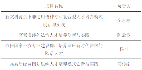 学校高度重视新文科研究与改革实践项目申报工作,依托学校多学科协调发展的优势,聚焦新文科,积极谋划,统筹布局。此次立项的项目包括语言类和非语言类项目各两项,充分体现了学校在新文科建设方面的成效。我校将聚焦落实立德树人根本任务,继续以新文科建设为抓手,以“外语+”“大数据”“人工智能”为载体,推进本科专业的融合创新发展,在新兴文科专业建设、课程思政建设、人才培养模式创新、课程教材建设、教学方法改革等方面积极推动“新文科”建设,着力培养具有家国情怀、全球视野、创新能力、担当精神的高素质国际化人才。