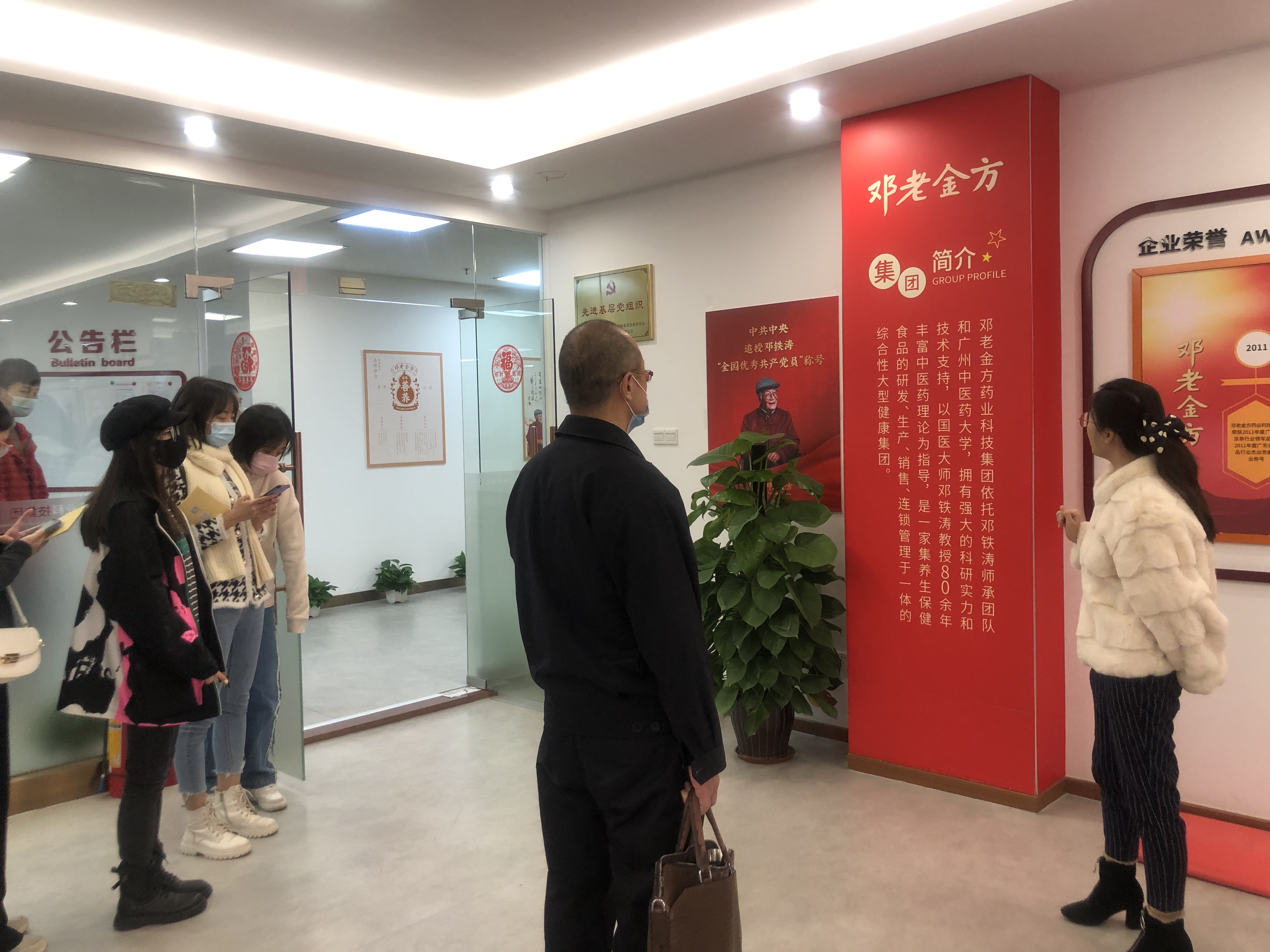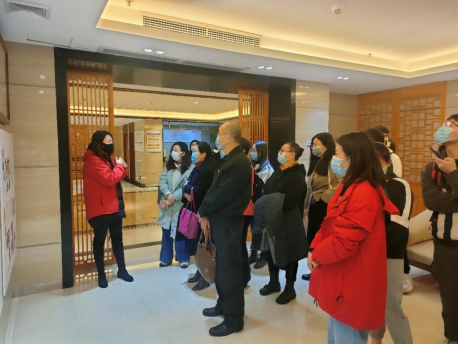 在工作人员的带领下,我院师生对新南方中医药大健康产业板块参观学习,走访了养和医药连锁药店、紫和堂国医馆、广州新南方中医研究院、紫和堂连锁健康驿站以及邓老金方药业科技集团。在紫和堂国医馆,工作人员带领参与师生进行参观,对医院概况、名医概况、治疗专科门诊介绍、专科特色等进行了解。在广州新南方中医研究院,工作人员分享了有关青蒿素的相关研究内容。在邓老金方药业科技集团,工作人员对邓老金方集团简介、公司主要历程以及相关养生产品进行了讲解,并参观了党建工作室。他们表示,新南方集团一直致力于传播中医文化,服务人类健康。在疫情期间,集团充分发挥自身中医药优势,全面参与疫情防控,为全球抗疫贡献了“广东智慧”和“中国方案”。