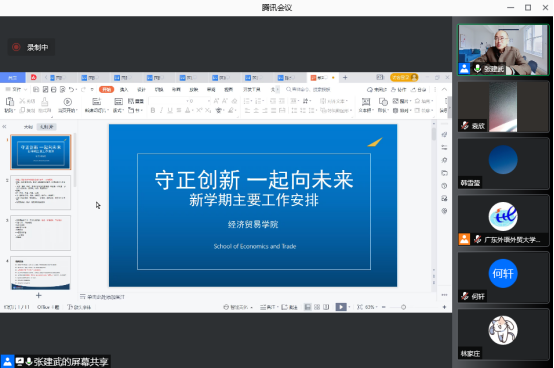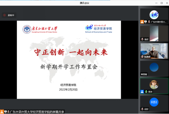 梁洁书记首先向大家致以新春的问候。她指出,寒假期间,很多老师在准备课题的申报,积极落实一流专业建设研讨会上提出的具体实施方案。她强调,疫情防控工作需要持续巩固,感谢全体经贸人的的共同努力。希望在大家的凝心聚力下,学院在人才培养、学科建设和社会声誉等各方面更上一层楼。
