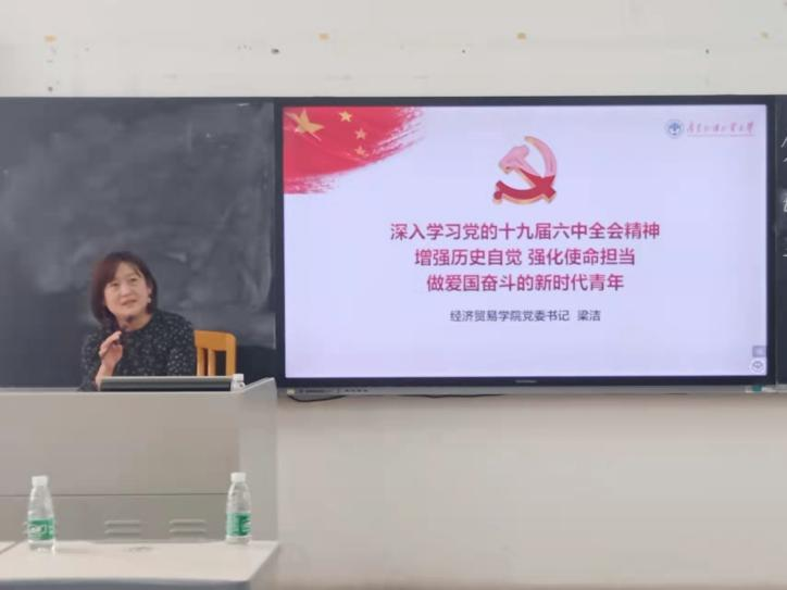 学院党委书记梁洁以“增强历史自觉,强化使命担当,做爱国奋斗的新时代青年”为主题,对学习党的十九届六中全会精神、传承学校红色基因、新时代对新青年的期望三个部分展开解读。