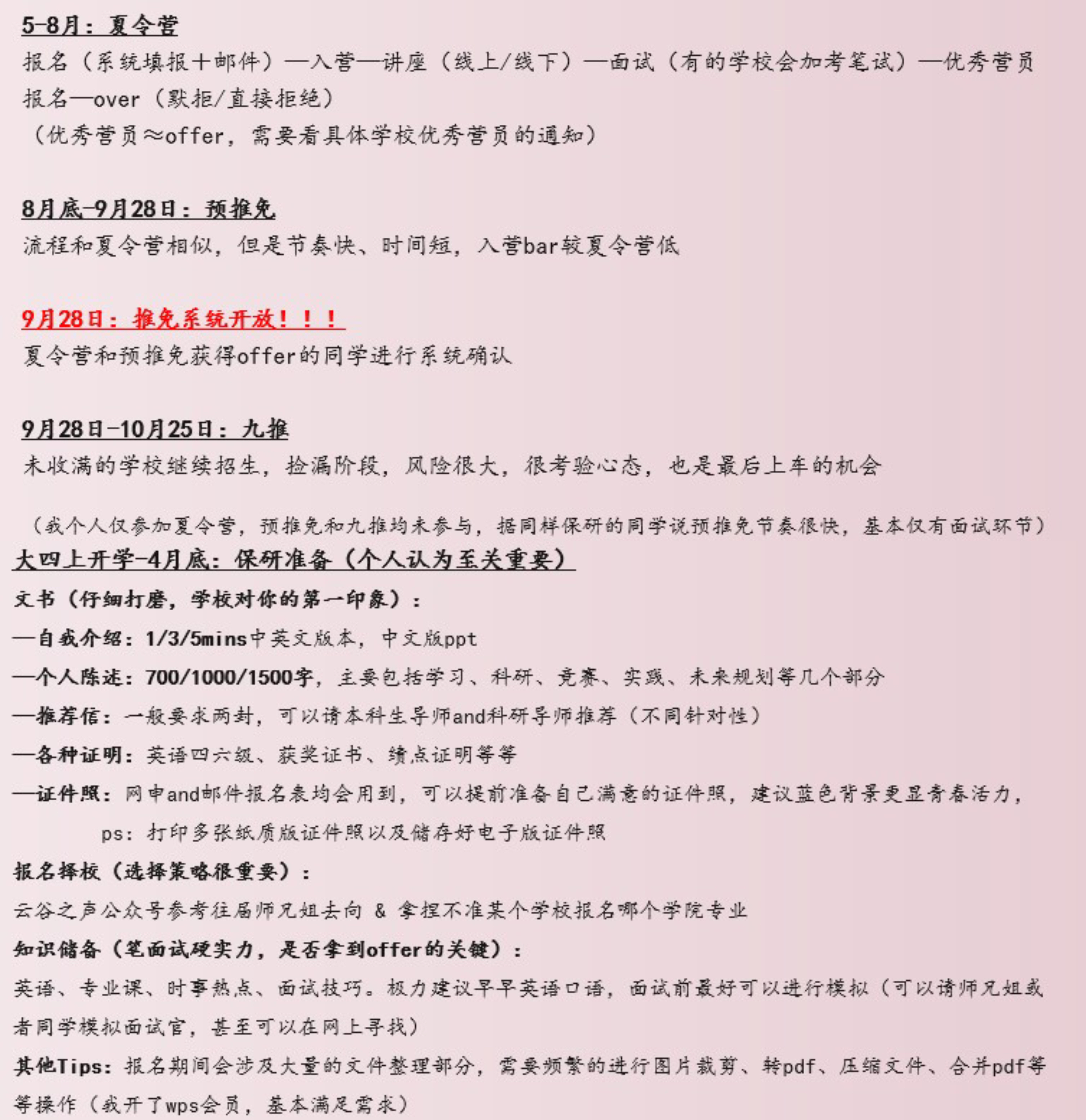 晓君师姐分享了详细的保研时间线和资料,见下图。并提出了绩点和比赛提升的方法。