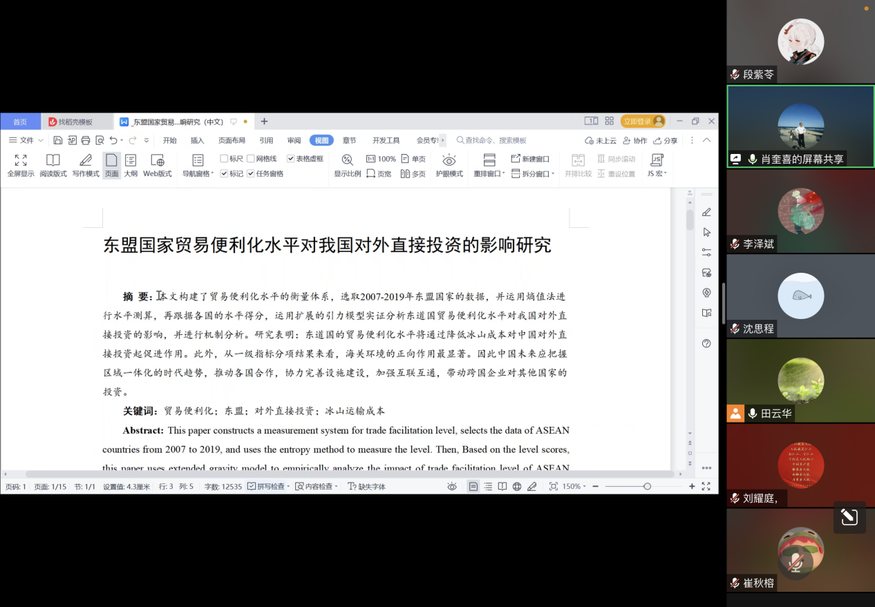 6月29日下午,经济贸易学院国贸系肖奎喜教授为国贸2020级与2021级学生进行了国贸专业优秀毕业论文实例教学与写作指导课,线上线下结合一共有60多位同学一起学习与研讨国贸系优秀毕业论文。国贸系主任田云华副教授担任本次指导课的主持人。