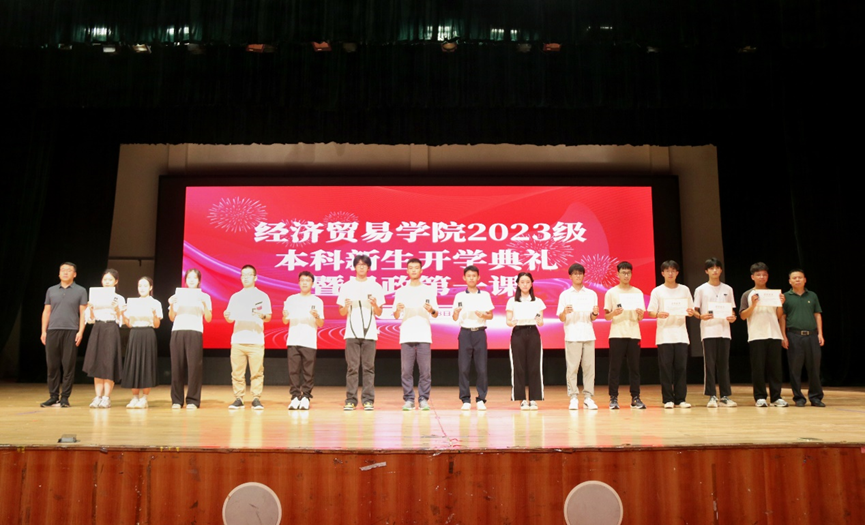 经济贸易学院2023级本科新生开学典礼暨思政第一课于9月8日上午在南校区大会堂隆重举行。学院院长孙楚仁、学院副院长张志明、学院副院长官华平、学院党委副书记陈思、教师代表徐明、全体辅导员、老生代表陈冠雲、新生代表黄煜皓及全体2023本科新生等出席开学典礼。典礼由学院党委副书记陈思主持。