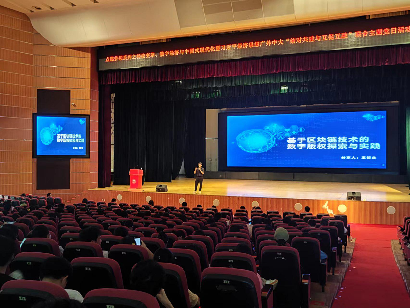 2023年9月24日上午,点燃梦想系列之数字经济与区块链广外中大联合主题党日活动研习会暨习近平经济思想研习社成立仪式在广东外语外贸大学广州大学城校区大会堂顺利召开。广东外语外贸大学经济贸易学院党委书记朱珍葶、副院长许月丽教授、中山大学岭南学院经济学专任教师第二党支部书记周先波、中山大学岭南学院经济学专任教师第二党支部成员焦倩副教授、上海可一澈科技有限公司创始人李慧子女士、东骏(广东)产业投资有限公司副总裁王哲文先生、UNISOT公司管理成员Torje Vingen Sunde先生,以及来自于我院数字经济专业、国际经济与贸易专业的一千余名学生,粤港澳大湾区高中优秀学生代表一百余人参加了本次论坛暨习近平经济思想研习会。本次联合主题党日活动由我校经贸学院党委委员、省级“双创”样板党支部书记、国贸系主任田云华副教授主持。