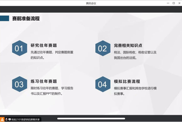 紧接着,李连盈同学从研究往年赛题、完善相关知识点、练习往年赛题和模拟比赛流程四方面介绍备赛过程和分享赛后感受。首先,李同学研究往年赛题时,将重点年份赛题的内容进行归纳总结,2013年主要为税务筹划及认定,2018年为税务风险和筹划,2021年为税务方案分析,2022年为相关方案的税收风险。其次,李同学向同学们分享了税务学习过程中使用的书籍和网站,为同学们提供了有力的帮助和指导。最后,李同学分享了在比赛过程中的感受,认为本次比赛激发了她对税务学习的热情,提升了她的专业能力,更为她未来的学习生活指明了方向。