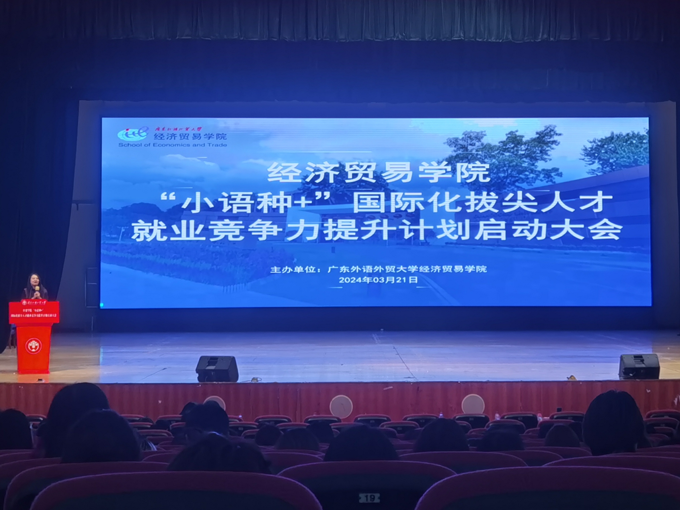为顺应时代潮流,响应国家战略,同时打造经贸学院就业品牌,服务学生高质量就业,经济贸易学院顺势而为,积极对接企业需求,并依托我校多语种办学优势,于3月21日下午,在我校大学城校区大会堂召开了经贸学院“小语种+”国际化拔尖人才就业竞争力提升计划启动大会。学院党委副书记陈思围绕“经贸‘小语种+’人才就业竞争力提升”主题作专题宣讲,经济贸易学院辅导员许嘉航、王智聪、黄林杰、李诗华,广外多语培项目中心资深讲师易芙蓉、徐华和近550名经贸学子出席会议,本次会议由辅导员曾嘉琪主持。