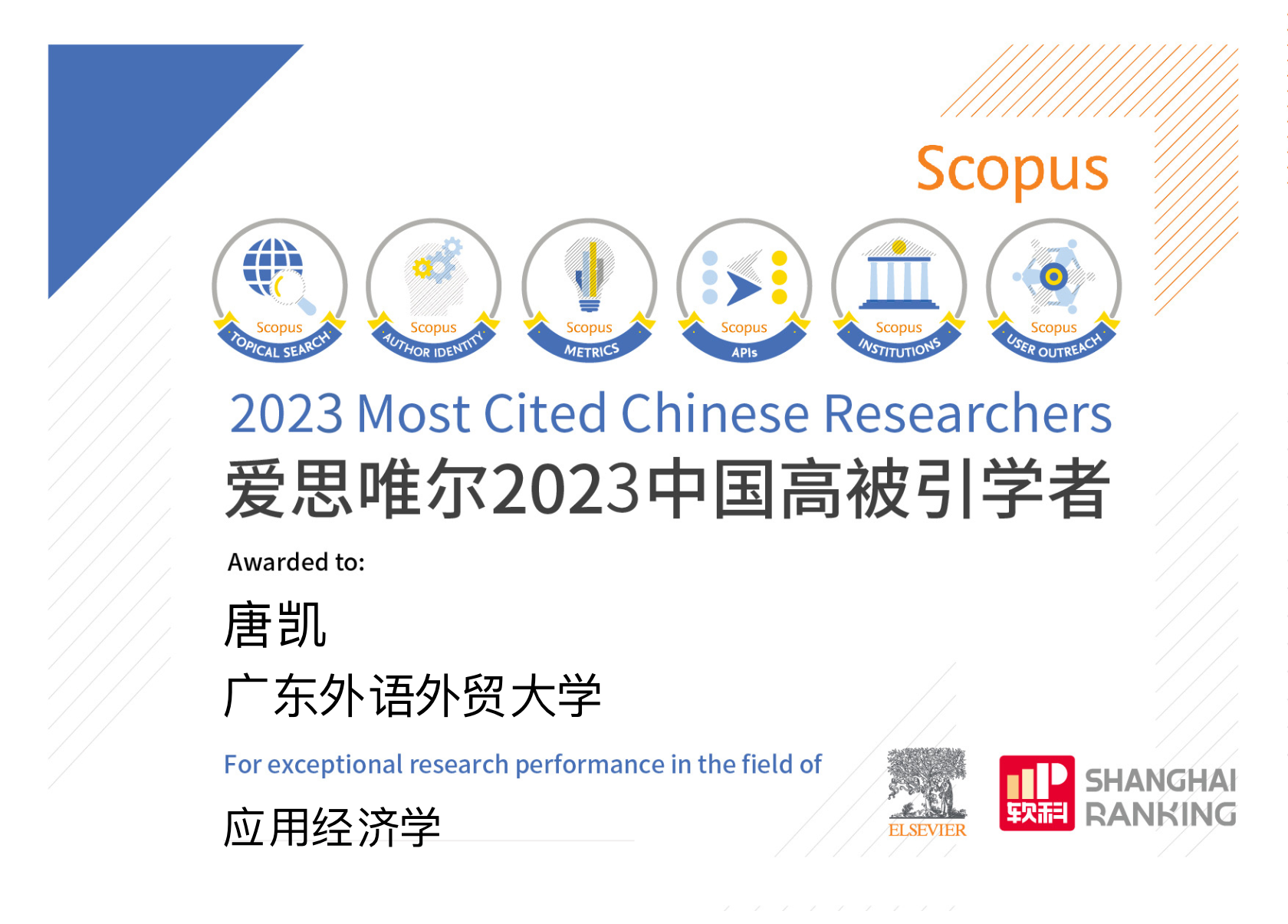 近日,爱思唯尔(Elsevier) 发布2023“中国高被引学者” (Highly Cited Chinese Researchers)榜单。广东外语外贸大学经济贸易学院唐凯教授又一次入选应用经济学学科“最具全球影响力的中国学者”榜单。