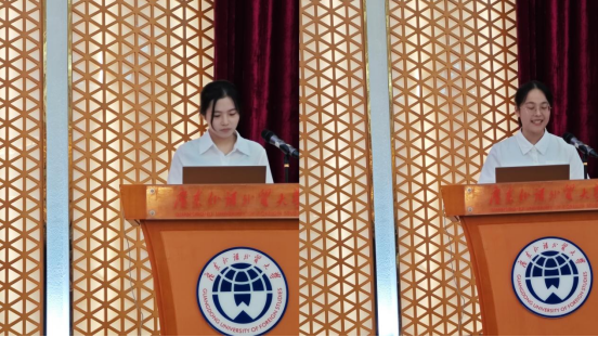在校研究生曹心悦同学分享了读研期间在广外学习生活的收获和感悟。她结合个人实际经验,勉励学子们尽快确定未来两三年的目标,保持对学习与生活的热爱,通过参加各类讲座、竞赛、比赛等提升综合能力。此外,她也衷心祝愿学子们在经贸学院这个大家庭中收获宝贵的师生情与友情。新生代表陈思恩同学表达了对学校、领导、老师的感恩之情。她坦言,在本科阶段,得益于广外老师的悉心教导和同学的殷切帮助,学习和生活上都圆满完成;现如今,她将同各位经贸学子一样,即将展开全新的探索之旅,对未来充满期待与向往。