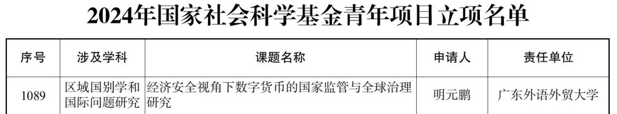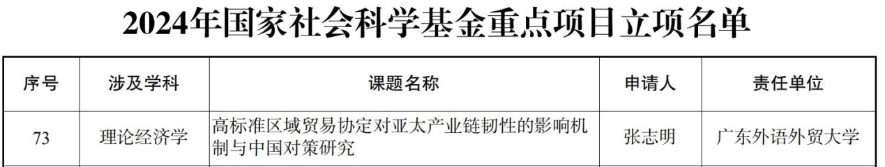 近日,2024年国家社会科学基金年度项目立项名单发布,我院共获批1项重点项目、2项一般项目、1项青年项目,获批立项项目数量位居全校第一。其中我院张志明教授的项目《高标准区域贸易协定对亚太产业链韧性的影响机制与中国对策研究》获全校唯一一项重点项目立项。同时,徐明教授的项目《防止返贫背景下结对帮扶提升脱贫地区多维人力资本的机制与路径研究》与王聪博士的项目《美欧“去风险”政策对RCEP区域产业链重构的影响与对策研究》获一般项目立项,明元鹏博士的项目《经济安全视角下数字货币的国家监管与全球治理研究》获青年项目立项。这是我院继国家自科基金项目成功立项1项后,在国家级项目等高层次成果领域取得的又一重要突破,标志着我院在该领域研究水平的稳定提升。