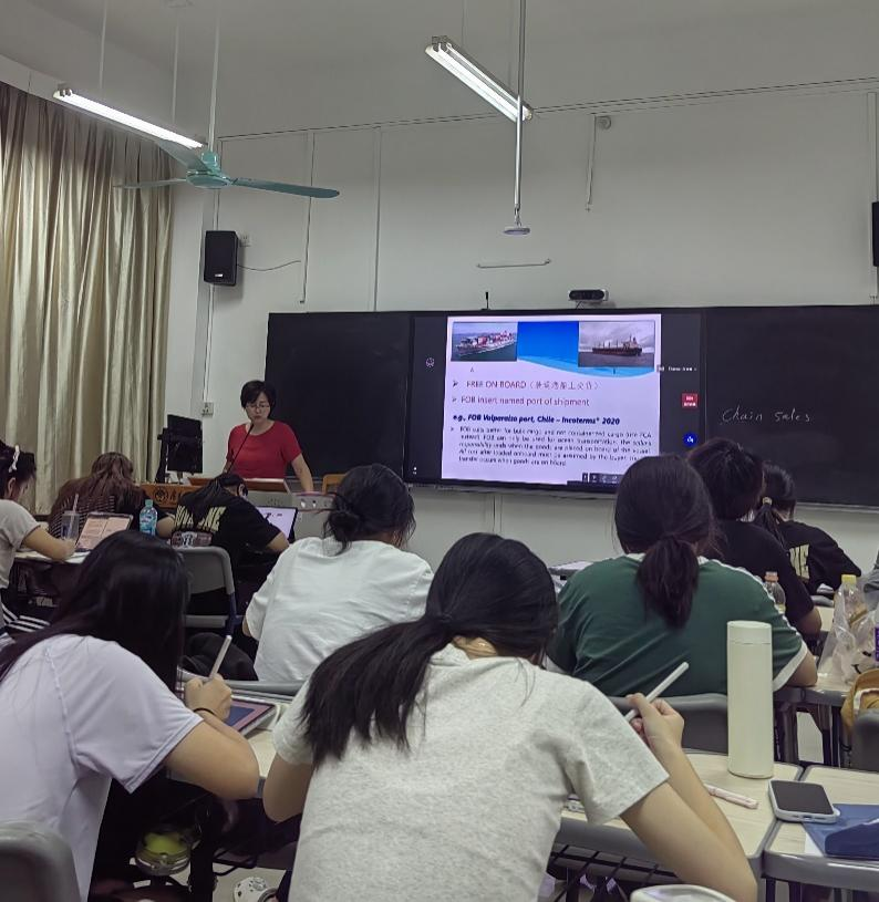 本网讯 10月22日晚上,我院国贸系教师刘琳为国际经济与贸易专业学生带来了一场精彩的《国际贸易实务》公开课,此次公开课紧紧围绕贸易术语中的“FOB”部分展开。本次公开课在教学楼F214进行,参会学生认真听讲,踊跃提问,收获颇丰,反响极佳。我院副院长许月丽教授也到场聆听了本次公开课。