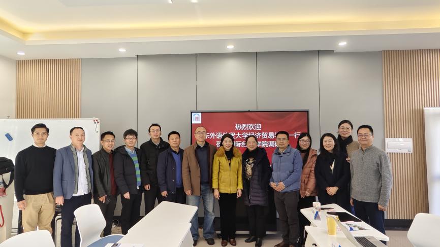 24日上午,上海对外经贸大学党委宣传部部长、国际经贸学院党委书记郭茜,国际经贸学院院长何欢浪,党委副书记陈雪,副院长代中强,副院长沈克华,行政办主任黄晓吉和上海对外经贸大学科研处副处长廖佳,接待了我院一行。