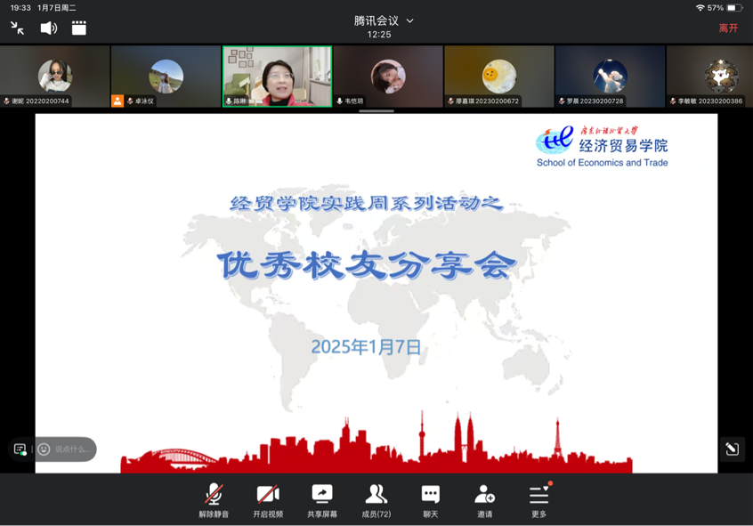 本网讯 1月7日晚,创新班校友分享会在腾讯会议举行,两位优秀创新班校友向学弟学妹分享个人留学及实习的宝贵经验。国际合作项目主任陈琳老师和外事秘书卓泳仪老师出席本次会议。