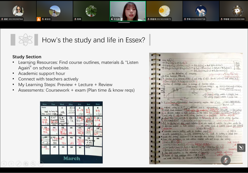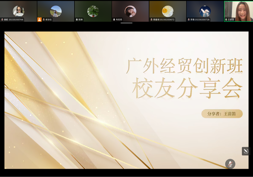 第一位校友是来自2019级国贸国创班的韦恺玥同学,她结合自身经历,分享了在英国埃塞克斯大学学习中积累的经验和学习方法,建议同学们提前进行个人规划,充分利用学校资源等,给同学们提供了有效的留学指导和帮助。同时,她还介绍了留学生活的有趣经历,并给大家提供了实习、工作方面的建议,帮助同学们提前规划实习方向,明确个人目标。