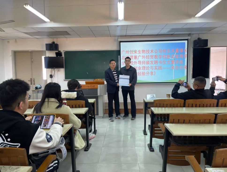 1月6日上午,我院教学实践周举行了关于“创新创业理论与实践”的讲座,我院王浩副教授特别邀请广东省教育工程改革项目《双创教育融入宏观经济学课程的实践与应用》项目组校外导师,广州创来生物科技有限公司何乐天董事长一行作经验分享。