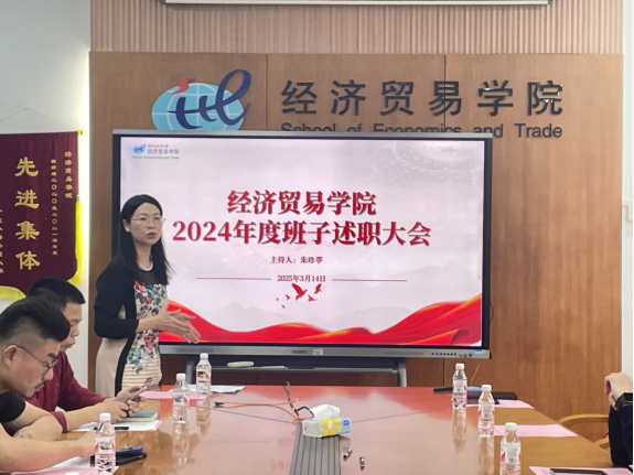 2025年3月14日上午,经济贸易学院在大学城校区院系楼301会议室举行了领导班子年度考核述职大会。出席本次会议的有学院领导班子成员、党委委员、教工党支部书记、学院系部室主任和辅导员代表,会议由党委书记朱珍葶主持。
