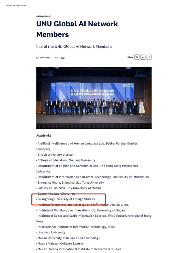 在广东外语外贸大学国际部、经济贸易学院和国际合作与可持续发展研究院的共同推动下,广东外语外贸大学于2024年10月成功加入联合国大学全球人工智能网络(UNU Global AI Network)并被列入成员列表。加入联合国大学全球人工智能网络,标志着我校AI 技术与人文社科深度融合发展的新开端,有助于推动和加强我校与国际高校、跨国企业和国际组织在人工智能领域开展理论、实践和人才培养的深度合作。近期,经济贸易学院、国际合作与可持续发展研究院与该网络沟通了后续业务合作事宜。未来,经济贸易学院与国际合作与可持续发展研究院将借助该网络的资源优势,为实现 2030 年可持续发展目标贡献广外力量。