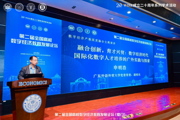 2025年5月10日,第二届全国高校数字经济教育发展论坛在厦门大学经济楼隆重举行。本届论坛由全国数字经济专业学位研究生教育指导委员会主办,厦门大学经济学院及相关研究院承办,聚焦“数字经济背景下的高等教育发展与人才培养新模式”,吸引了全国高校、科研机构及行业领域的专家学者参与。广东外语外贸大学党委常委、副校长申明浩,经济贸易学院院长孙楚仁受邀出席并作主题发言。