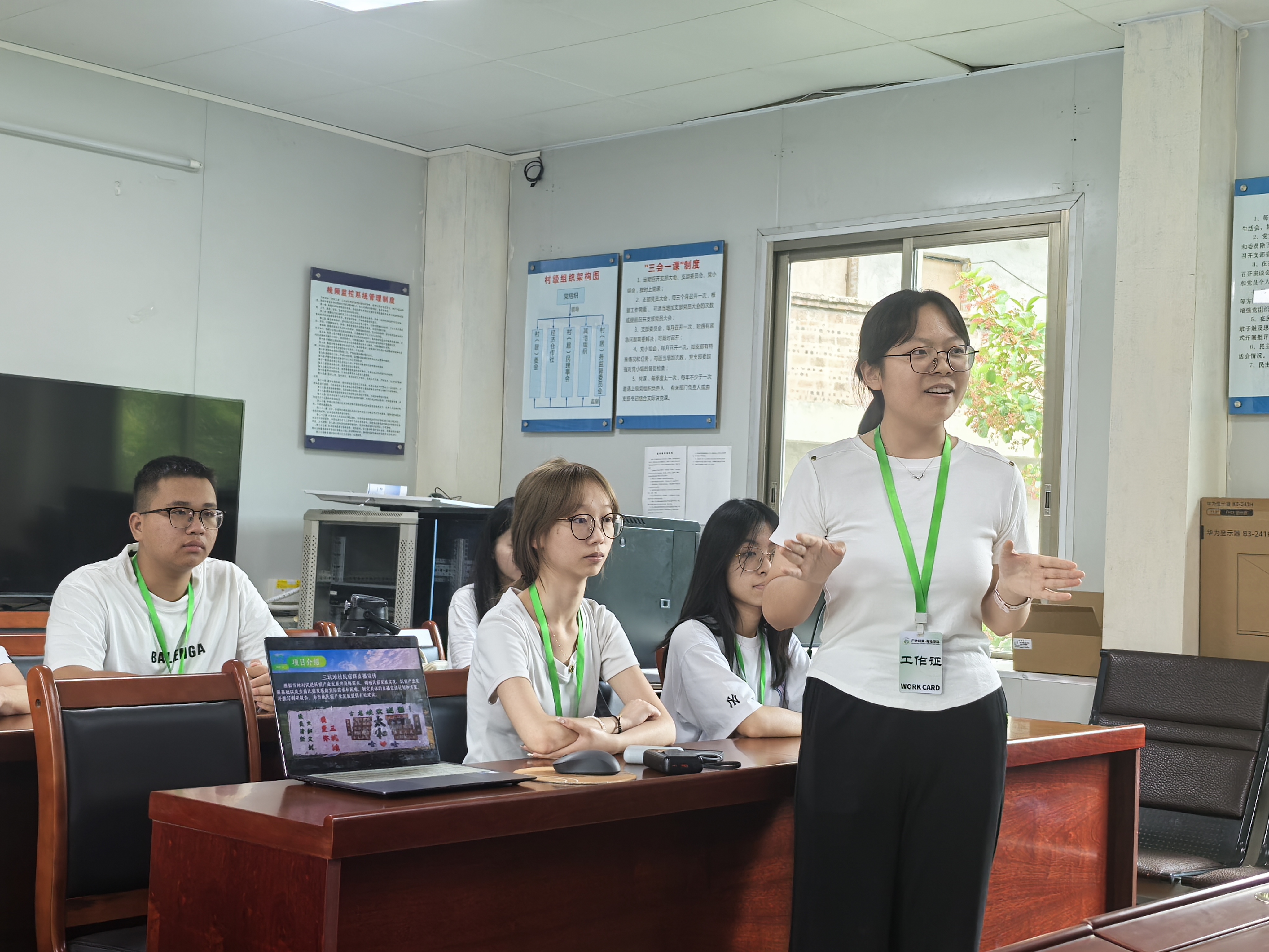 次日,团队探望了由税收学第二学生党支部组建的“绿织青梦”实践团。该团队正围绕“绿美乡村”建设在桂头镇各村开展调研,陈哲代表学院向成员们致以关怀,并嘱咐队伍需要认真撰写有意义的调研报告,不负此行。我校“双百行动”驻乳源服务队队长毕建永建议团队聚焦“经济价值与景观价值协同”深化调研,让广外青年智慧赋能乡村振兴。
