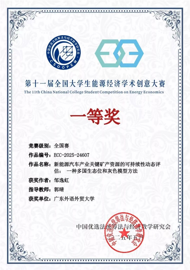 本次大赛遵循校赛、区域赛、国赛三级赛制,吸引了全国724所高校的3.1万余支队伍报名参赛。邹逸虹同学荣获广东-香港-澳门赛区一等奖,并成功晋级全国总决赛。她运用生态位模型对中国及主要经济体关键矿产资源的可持续性进行系统评估,并基于灰色模型对其未来发展趋势进行量化分析,充分展现了经贸学子扎实的专业功底与严谨的学术思维。经过激烈角逐,最终荣获全国一等奖。经贸学院将继续发挥以赛促教、以赛促学精神,将教学、实践与创新有效结合起来,不断提升人才培养质量。