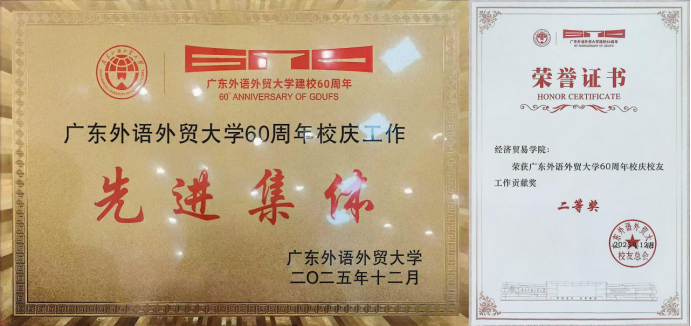 在广东外语外贸大学六十周年校庆之际,学院汇聚校友力量,学院校友会人数超过3500人,累计捐赠金额326余万元,隆重举行经贸校友会第五届理事会换届大会,走访湖南、北京、香港等地方和地区校友会6个,校友企业10余家,签署产学研项目3项,组织多个校友班级返校值年庆,校庆日返校校友数近800人位居全校前列。学院创新打造了“经瑛成长说”校友讲堂这一品牌活动,特别邀请原广州对外贸易学院党委书记兼院长石畏三教授等知名校友作为主讲嘉宾开展讲座10余场,分享行业经验与人生感悟,助力学子成长。通过构建校地、校企、校友协同育人的全新格局,学院的社会影响力得到了进一步提升。学院获评校庆工作先进集体以及校庆校友工作贡献奖二等奖。