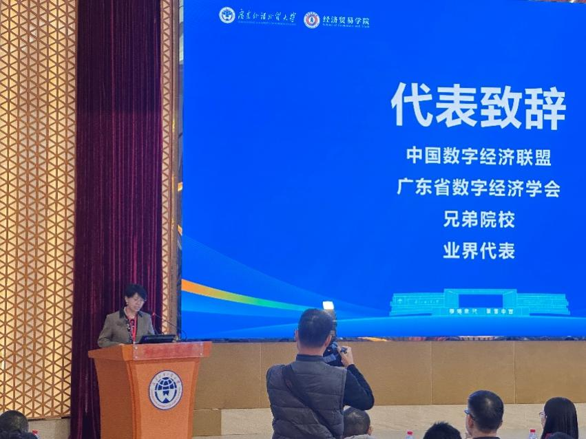 中国数字经济联盟联席秘书长、首都经济贸易大学北京数字经济发展研究院常务副院长李平教授代表中国数字经济联盟在致贺词环节中表示,在数字经济加速演进、全球经济深刻变革的背景下,广东外语外贸大学成立数字经济现代产业学院与数字经济系,体现了高校主动回应国家战略需求、前瞻布局新兴交叉学科的责任担当。联盟将充分发挥平台优势,与广外在政策研究、标准建设、产教融合和国际交流等方面深化合作,共同推动数字经济理论创新与产业实践深度融合。