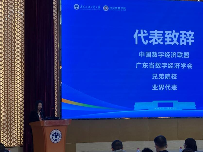 广东省数字经济学会副会长、广东财经大学科研部部长王方方教授代表广东省数字经济学会致贺词时指出,粤港澳大湾区正加快推进实体经济与数字经济深度融合,迫切需要高水平学科支撑和高素质专业人才。广外立足外语与经贸优势,布局数字经济学科体系、举办高端学术论坛,是服务国家数字中国战略和广东高质量发展的重要实践。学会期待与广外在学术研究、成果转化和人才培养等方面持续深化合作。