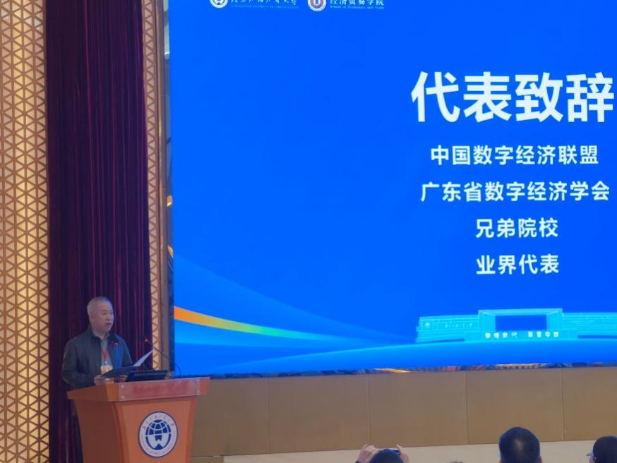 中国数字经济联盟联席秘书长、首都经济贸易大学北京数字经济发展研究院常务副院长李平教授代表中国数字经济联盟在致贺词环节中表示,在数字经济加速演进、全球经济深刻变革的背景下,广东外语外贸大学成立数字经济现代产业学院与数字经济系,体现了高校主动回应国家战略需求、前瞻布局新兴交叉学科的责任担当。联盟将充分发挥平台优势,与广外在政策研究、标准建设、产教融合和国际交流等方面深化合作,共同推动数字经济理论创新与产业实践深度融合。