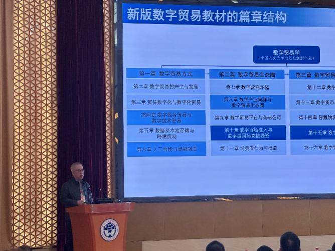 国家级人才、浙江大学中国数字贸易研究院院长马述忠教授围绕“数字贸易课程建设与学科发展”作主旨演讲,重点阐释了数字贸易教材体系建设与中国自主知识体系建构的理论逻辑与实践路径。他指出,数字贸易发展迅速,亟须在学科建设和课程体系中形成具有中国特色、能够参与国际话语竞争的标识性概念体系。马述忠结合其团队长期研究成果,系统介绍了数字贸易标识性概念演进、自主知识体系建构以及教材迭代创新的思路,强调应以教材建设为重要抓手,推动数字贸易理论创新与教学实践深度融合,为讲好中国数字贸易故事奠定坚实学术基础。