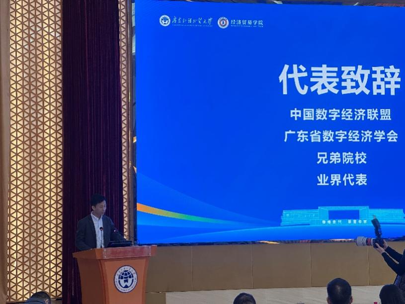 对外经济贸易大学全球创新与治理研究院执行院长吕越教授作为兄弟院校的代表致贺词指出,广外成立数字经济现代产业学院与数字经济系,是顺应数字技术革命和产业变革趋势的重要举措。对外经贸大学愿与广外进一步深化合作交流,围绕数字经济与国际贸易深度融合开展联合研究与人才培养,共同探索数字时代国际化人才培养新路径。