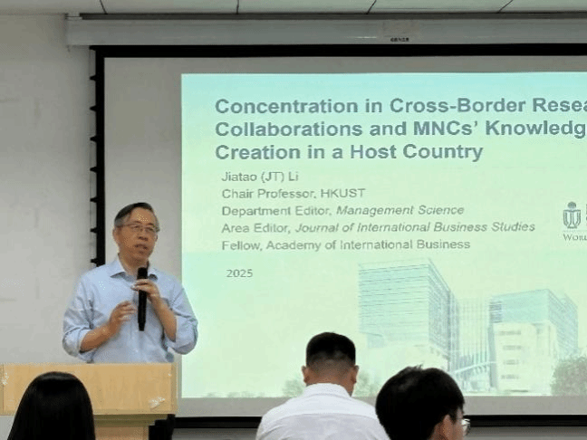为助力国际商务专业学子把握学术研究与行业发展前沿,搭建高水平学术交流平台,我院海外名师大讲堂特邀香港科技大学李家涛教授带来“跨国研发合作的集中度与跨国公司在东道国的知识创造”专题讲座。本次讲座聚焦跨国研发合作与国际商务战略前沿,为我院MIB研究生、博士生及教师带来了一场兼具理论深度与实践价值的学术盛宴。本次讲座由我院院长助理郭晴教授主持。