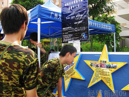 9月17日中午,国际经济贸易学院团委学生会招新咨询摊位在校道上准备就绪,接受新生的有关三天后的经贸团学招新咨询。现场布置有各具特色的部门简介和别出心裁的大家庭球衣展板,表现出经贸团学的凝聚力,吸引着沿道新生驻足咨询。