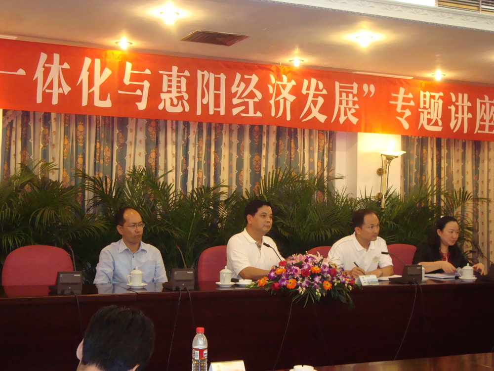 在专题讲座上,区委书记邓木林作了“区域经济一体化与惠阳经济发展”的报告,全面阐释了惠阳区参与区域经济一体化的努力方向。他说,根据《珠三角地区改革发展规划纲要2008-2020年》的要求,惠阳区将以现代服务业为主导,建设成为东莞、深圳、惠州市和大亚湾区的服务枢纽,实现基础设施、区域功能、社会保障功能、公共服务设施和信息共享的一体化建设。同时,惠阳区还要引进一批优秀企业,做大做强特色产业,实现经济的可持续发展。