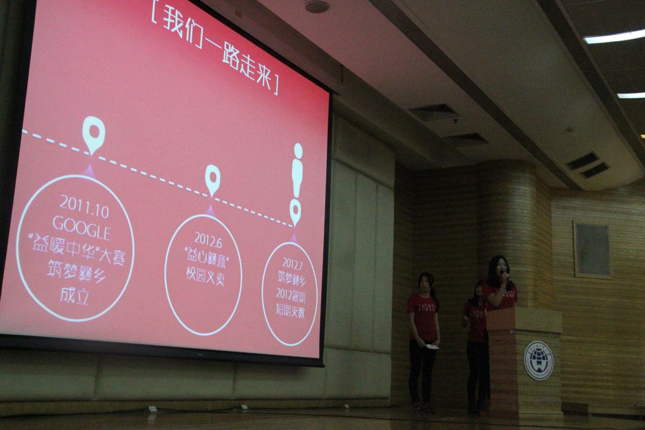 无独有偶,另一个候选者—— “筑梦彝乡”公益团队也致力于公益事业。它成立于2011年10月,是以广外在读大学生为主要力量组建的一个公益创业组织。作为一个教育型的公益团队,其关注四川、凉山彝族自治州,目前通过有针对性的地区性调研与持续型的教育资源输送,以期达到促进当地教育,并能建立长期且可持续的“筑梦模式”,推广筑梦团队的公益项目。在问答环节中,关于中国梦,团队有着独树一帜的看法。队员指出,要实现中华民族伟大复兴,必须从倡导“人人公益”。
