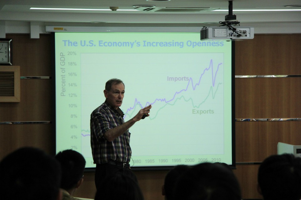 2013年11月21日下午,广外MIB商务讲堂第十六讲在北校区第九教学楼305教室举行。本次讲座由来自美国阿默斯特学院经济学家 Geoffrey Woglom主讲,题目为“Trade Imbalances: A problem for the US and China”和“The Fed’s Response to the Global Recession: Three Sides to Ben Bernanke?”。讲座由MIB中心刘琳老师主持,2013级全体国际商务硕士参加。