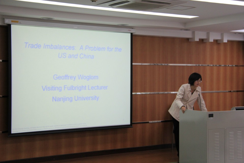 第一个话题。Woglom教授首先简单回顾了进出口贸易的相关词汇,并对美国和中国1970年后至今的进出口量的变化趋势进行了分析对比,对比显示,尽快中美两国贸易量均呈现不停增长的趋势,但是中国经济的外向度(出口依存度)高于美国。接着,Woglom教授从中美债务关系的角度解释了中美进出口关系不平衡,并且分析了中国对美贸易顺差的原因。通过对美国经济史的简述,他指出,美国的逆差来源于美国的高投资,低个人储蓄,政府预算赤字;而中国的高储蓄、高投资与中国的GDP增长有很大相关性。