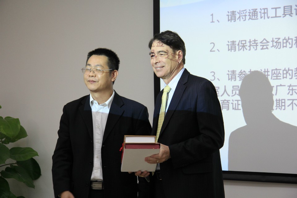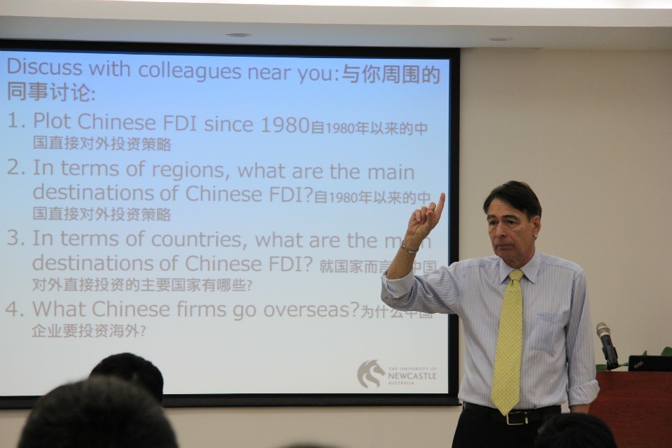 本网讯 2013年12月5日下午, 广外大云山学者,澳大利亚纽卡斯尔大学副校长尼古拉斯教授应邀在北校区教师发展中心多功能会议室面向全体广外师生做了题目为“中国对外直接投资:理论与实践”的讲座。广外大人事处方迎生处长,MIB中心主任杨励教授,全体2013级MIB学生出席讲座,本次讲座有MIB中心刘琳老师主持。