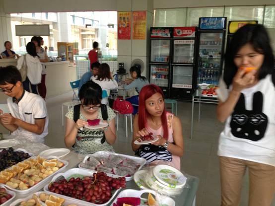 启动仪式上,“微笑一号果园” 创业团队还精心准备了1000多份组合水果,免费赠送同学们。许多广外学子在一天疲惫的课后,意外品尝到了美味水果,分外开心。当天下午,广外的“光棍儿们”成群结队沉浸在“微笑一号果园”里;朗朗的笑声,回荡在美丽清爽的广外校园上空,为“光棍节”增添了多彩的一笔。