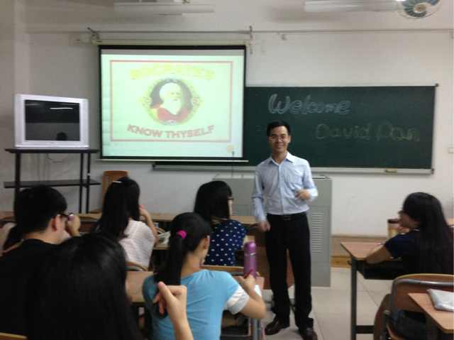 6月20日,应广东外院外贸大学国际经济贸易学院杜玉平副教授的邀请,广外MBA学院在读硕士的David Pan来我校就“选择·成长·梦想” 的主题在北六教B202与我校2012级国际经济与贸易创新班的同学分享他的看法及经历。