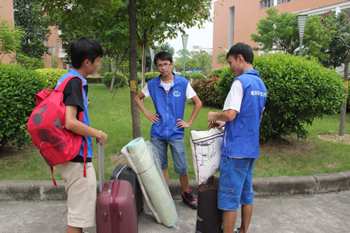 从清晨到日暮,从学期末到学期初,志愿者认真筹备,全力执行,在炎炎烈日下挥洒汗水。有的人徒手把20多公斤重的箱子搬上7楼;有的人不断奔走,带领新生去宿舍、买军服或大本营。