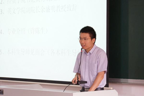 在热烈的掌声中,英文学院副院长余盛明发表了讲话。他对创新班同学表示了欢迎之后,也提出了自己的要求。他号召同学们积极参与英文学院的活动,多与老师同学交流。他还强调了北校区所特有的语言文化氛围,希望同学们能抓住语言锻炼的机会。最后,余院长介绍了英文专业的概念,让同学们重视英文基础,注重长期的人文素质培养。
