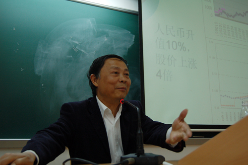 在学生提问环节,陈教授针对人民币国际化提出了自己的看法,人民币国际化要以我国实行资本账户下的自由兑换为基础,尽管我国外汇储备总量第一,但受制于我国国内经济发展模式。我们通常说的人民币升值是针对美元来说,实际上人民币汇率对其他国家货币的汇率波动还是较明显,也较符合市场规律,人民币汇率的度量要以有效汇率为基准。在谈到汇率波动对我国地产行业的影响时,陈教授指出,从国家近年来的地产调控手段来看,地产确实存在泡沫,正因为有美国次贷危机的前车之鉴,我们房地产价格的抑制,是符合中国经济发展预期的,由于我国资本账户存在管制,外资对地产投资还是较小部分。