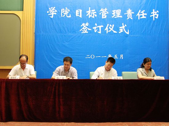 李铁立院长、黄秀娟书记出席了签订仪式,并作为学院代表与大学隋广军书记、仲伟合校长签署了学院目标管理责任书,这象征着学院新一轮目标管理工作正式启动。学院也将认真按照目标管理所确定的各项指标,带领全体教职工,以教学为中心,科研为突破点,扎实做好各项工作,为加强学院学术建设和提升学校地位做出努力。