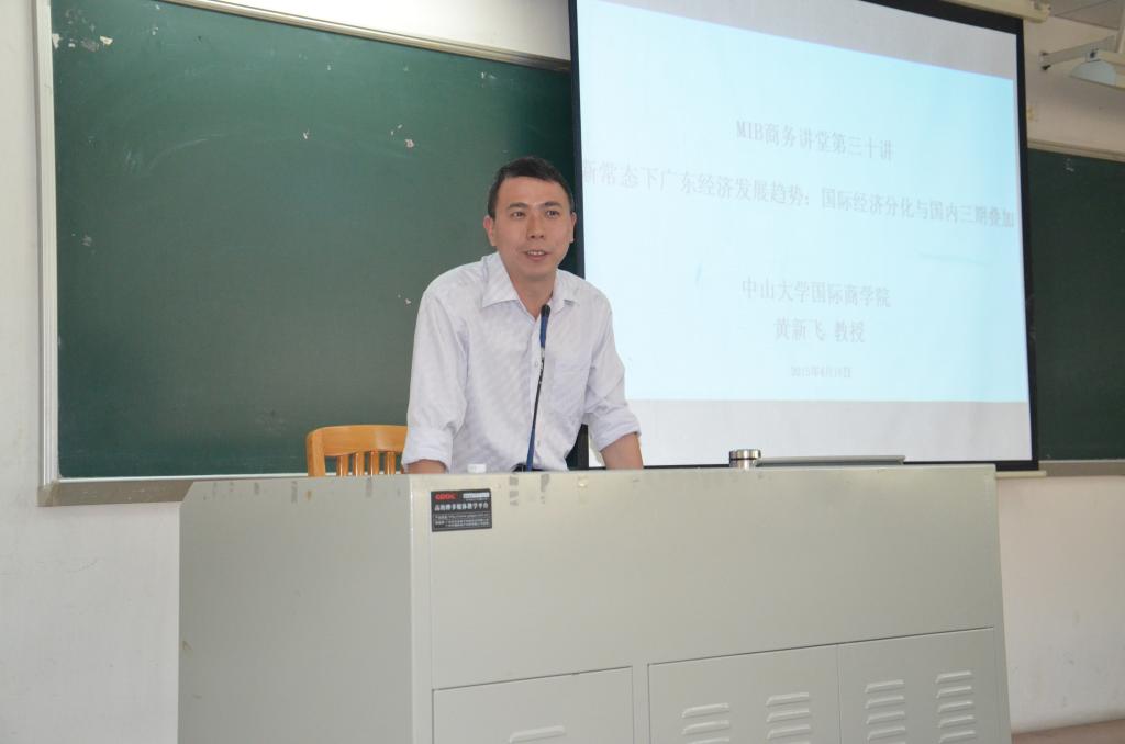 4月16日下午,经贸学院MIB商务讲堂第三十讲在南校区F207教室举行。中山大学国际商学院黄新飞教授做了题为“新常态下广东经济发展趋势——国际经济分化与国内三期叠加”的精彩演讲。本期讲座由MIB教育中心主任张金艳教授主持,2014级MIB教育中心的学生参与了讲座。