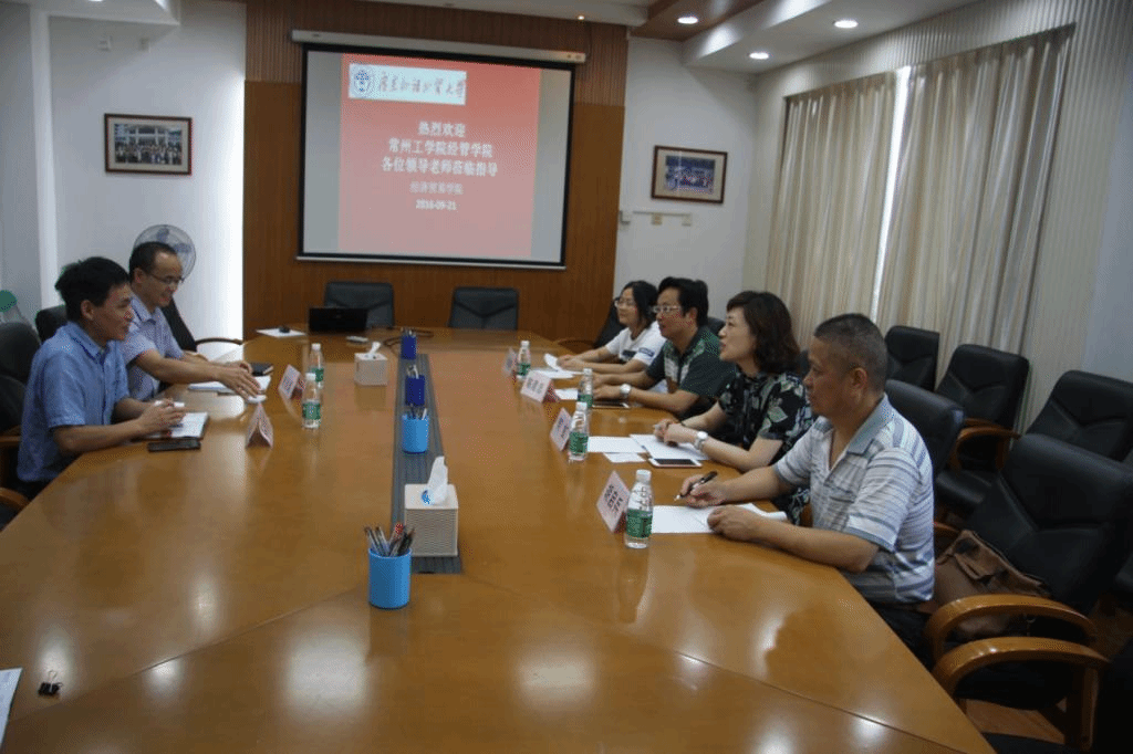 2016年9月21日上午,常州工学院经管学院副院长何虹教授、应用经济系主任陈建忠副教授、专业老师胡启兵副教授、余敏丽博士一行来访我院,我院副院长魏章进教授和肖奎喜教授、袁群华老师和冯然老师在我院会议室进行了亲切会谈。